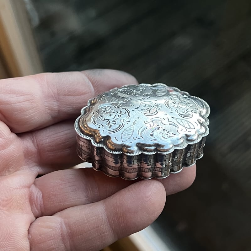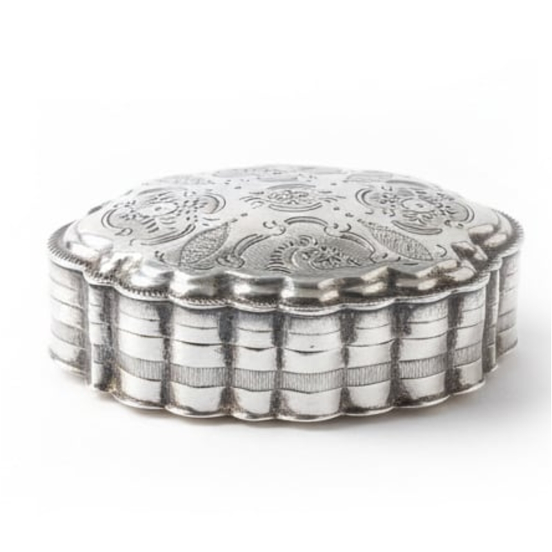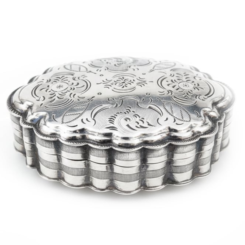 Antiek Hollands zilveren pillendoosje gemaakt door Pieter Kruijt Jr. Te Schoonhoven in 1864. Mooie grote zilveren pillendoos in een bijzonder geschulpte ovale vorm met een fijntjes gegraveerde deksel. De bodem van de doos met een licht lijntjes patroon. Stevige zilveren doos in zeer goede staat, 6,3 x 5 cm x 1,9 cm hoog en hij weegt 26,7 gram.