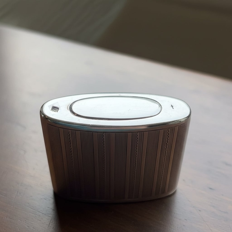 Het doosje is 5,5 cm x 4,3 cm x 1,5 cm en hij weegt 56 gram. De binnenzijde van het doosje is verguld om aanslaan tegen te gaan.