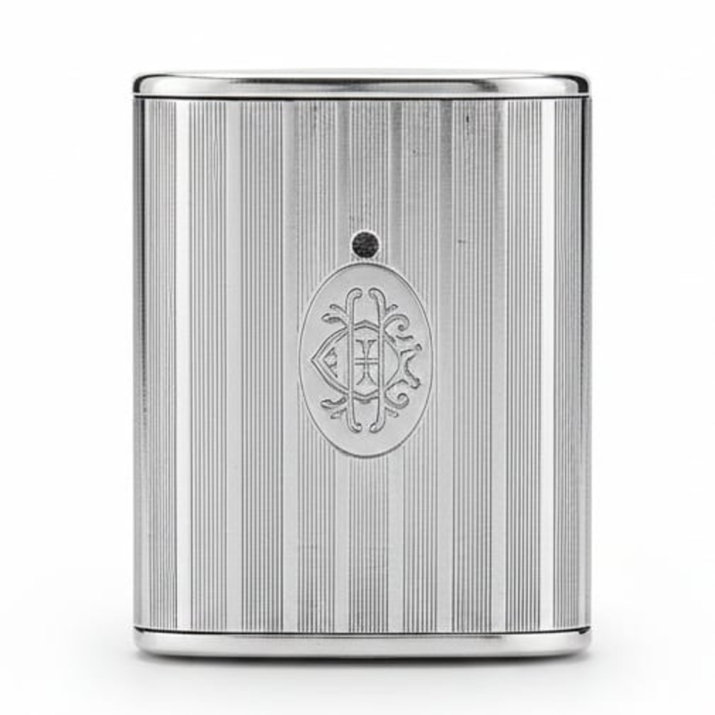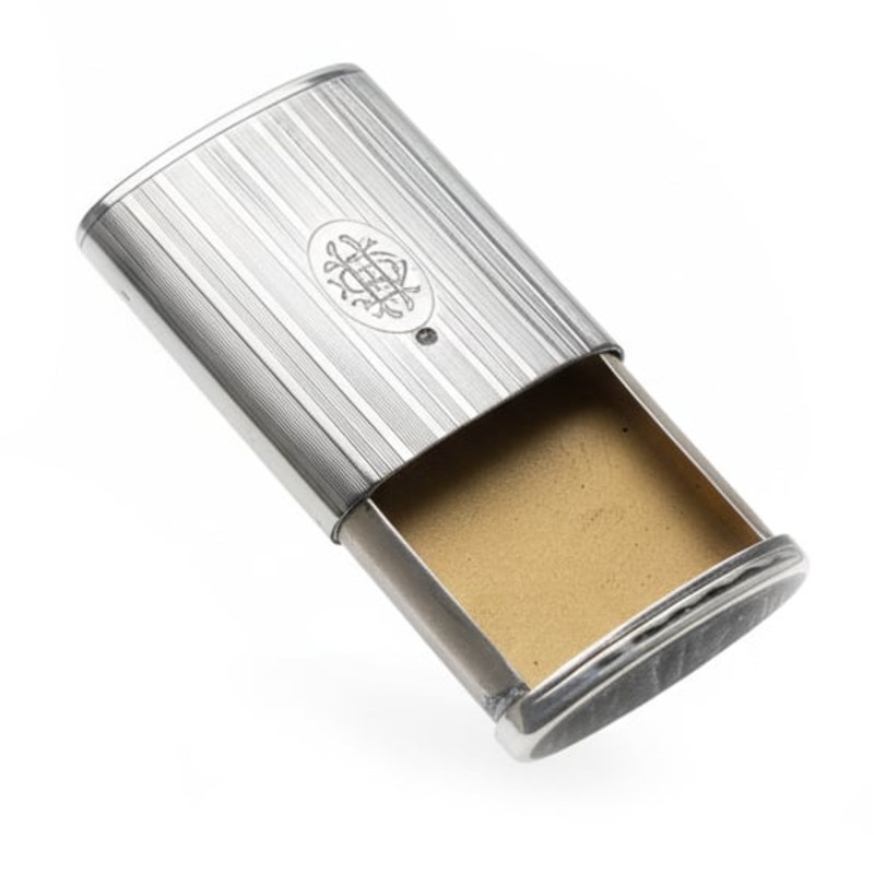 De buitenzijde is fraai uitgevoerd met een fijn geribbeld lijnenspel, een decor dat direct doet denken aan de strakke vormentaal van de Art Deco-periode. In het midden bevindt zich een cartouche met sierlijk monogram GH, wat het doosje een persoonlijk en karaktervol uiterlijk geeft.