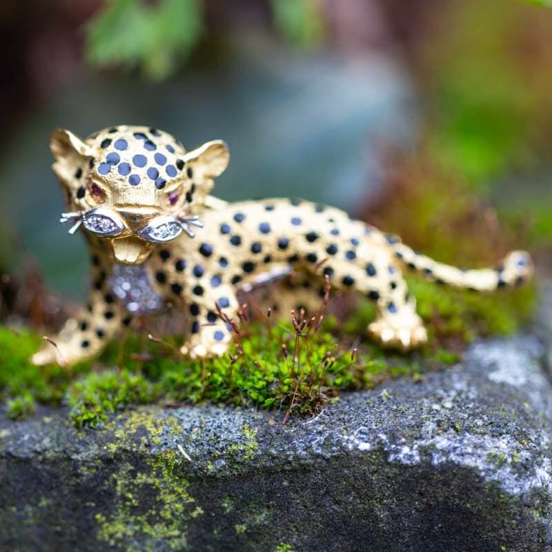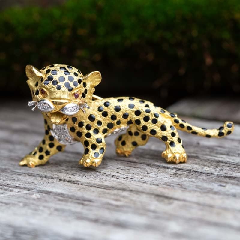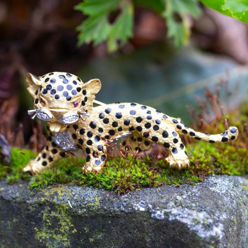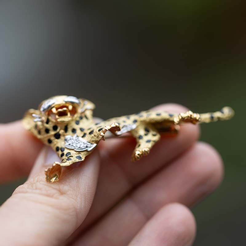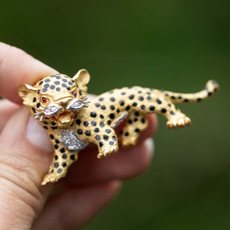 Op het lichaam van de panter zitten zwarte emaille vlekken die hem net echt doen lijken. Het contrast tussen het goud, de stenen en het emaille maakt deze broche uniek.