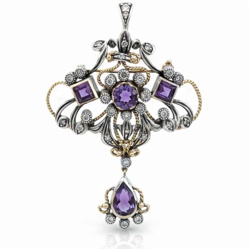 Een bijzonder elegante broche die tevens als hanger gedragen kan worden, uitgevoerd in een rijke combinatie van 18 karaat goud en zilver, vervaardigd in Nederland tijdens de revivalperiode van de jaren ’60–’70. Centraal schittert een ronde facetgeslepen amethist, geflankeerd door twee vierkante amethisten en bekroond met een sierlijke hangende druppelvormige amethist.