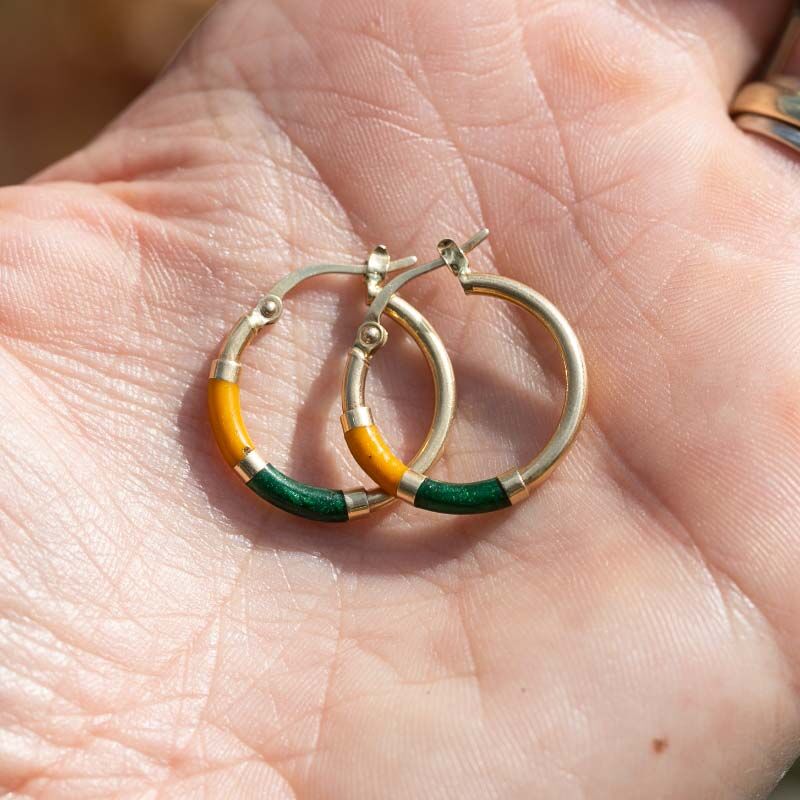 Deze elegante oorbellen zijn vervaardigd uit 14 karaat goud en hebben een klassieke ronde vorm. De afwerking met oranje en groen emaille geeft ze een verfijnd kleuraccent dat subtiel opvalt.