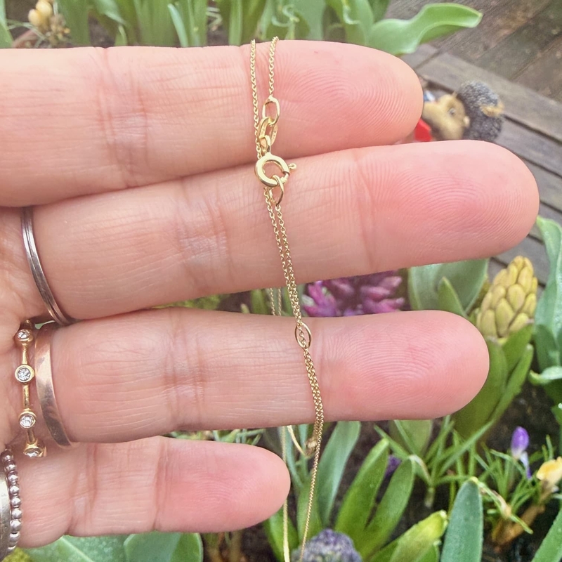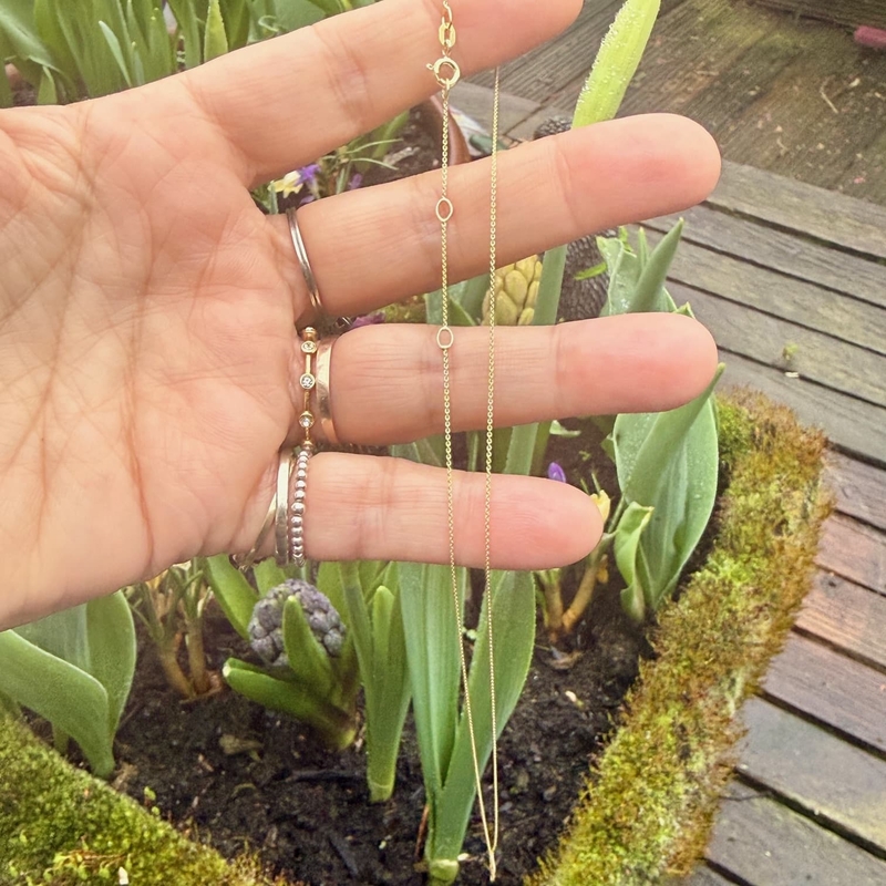 Het gouden collier kan gedragen worden op drie verschillende lengtes: 41 cm, 43 cm en 45 cm. Hierdoor past het zich moeiteloos aan diverse halslijnen aan. De breedte bedraagt slechts 0,8 mm, waardoor het sieraad verfijnd oogt zonder zijn aanwezigheid te verliezen.