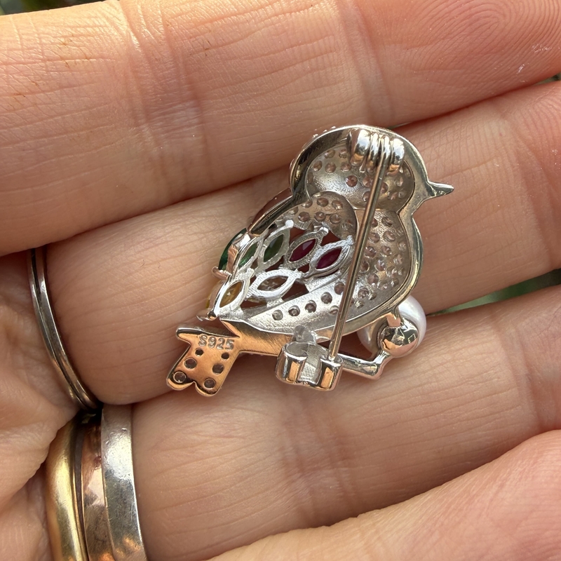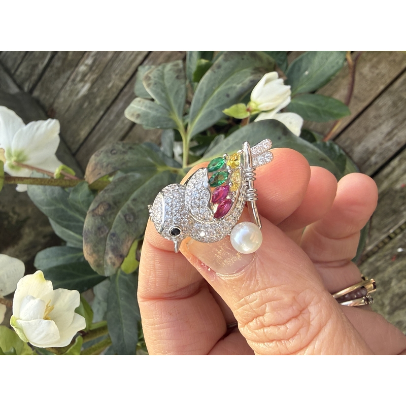 Deze zilveren broche in de vorm van een vogel is rijkelijk bezet met sprankelende zirkonia en afgewerkt met een witte zoetwaterparel op de tak. Het leuke, speelse ontwerp toont een schattig vogeltje dat op een tak zit: het lijfje is ingelegd met zwart (het oogje), wit, groen, rood en geel zirkonia voor een kleurrijk en levendig effect. De broche wordt nieuw geleverd in een geschenkdoosje en is daarmee ook heel geschikt om cadeau te geven.
