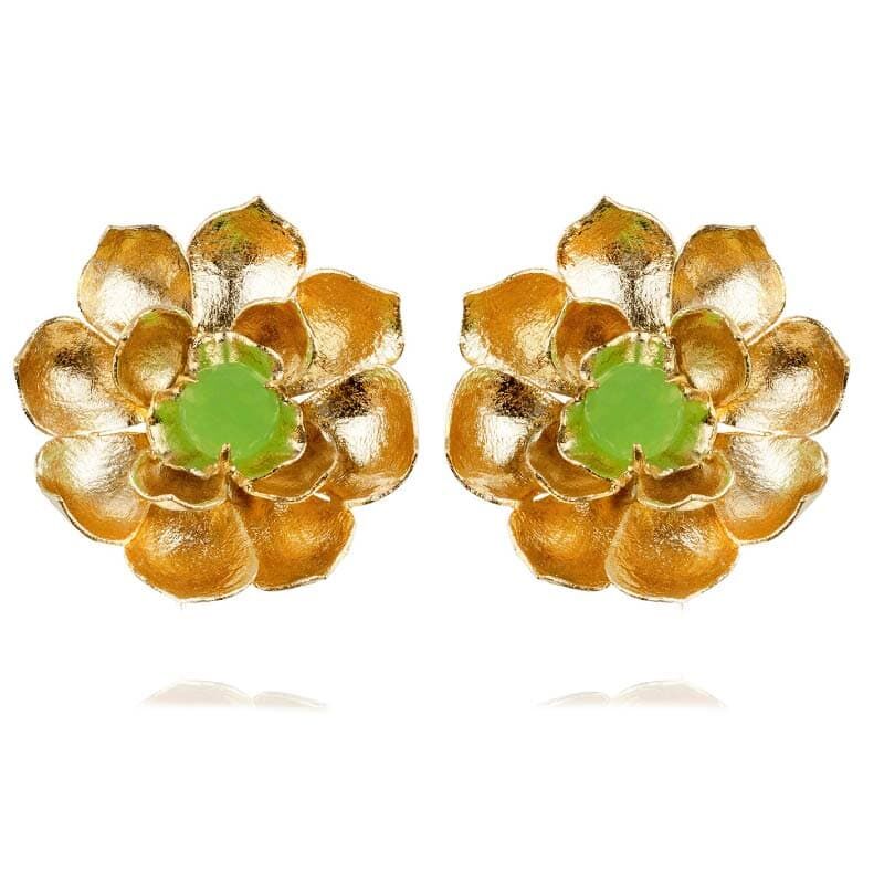 Deze prachtige oorbellen van Bruno da Rocha zijn echte blikvangers. Gemaakt van mat verguld zilver in de vorm van een bloem, stralen ze kracht en verfijning uit. In het hart van elke oorbel zit een cabochon geslepen jade, stevig vastgezet met drie pootjes in chatonzetting. De groene kleur geeft de sieraden iets natuurlijks en rustgevends.