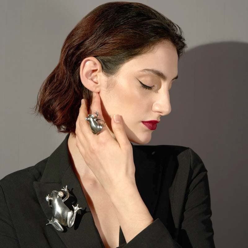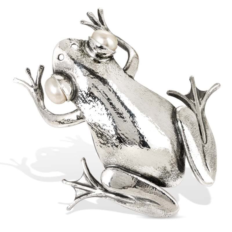 Kikkerbroche in mat zilver met parels; draagbaar kunstwerk én stijlvol object voor thuis.