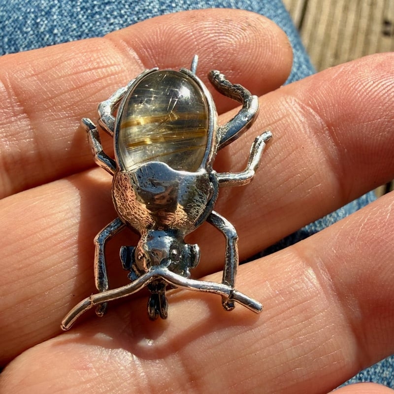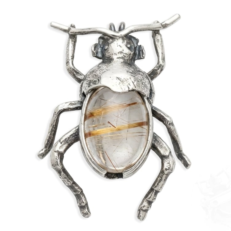 Het ontwerp van de zilveren kever valt op door de natuurgetrouwe textuur van de poten en de kop. Dit ambachtelijke reliëf vormt een karaktervol contrast met de gladde, transparante edelsteen. In de steen zelf zijn de kenmerkende naaldvormige insluitingen goed zichtbaar, wat elk exemplaar een eigen identiteit geeft. Bruno da Rocha laat hier zien hoe ruwe elementen uit de natuur op natuurlijke wijze versmelten tot een krachtig en harmonieus sieraad.