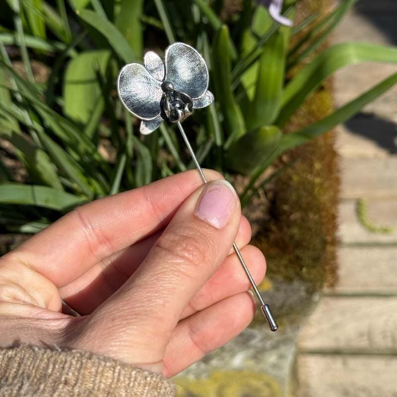 De broche heeft de elegante vorm van een orchidee compleet met prachtig bewerkte bladeren. Elk detail is zorgvuldig uitgewerkt in 1e gehalte zilver. Met een lengte van 9,7 cm en een breedte van 3,2 cm valt dit sieraad mooi op zonder te overdrijven. Het gewicht bedraagt slechts 8,55 gram – licht genoeg om comfortabel te dragen.