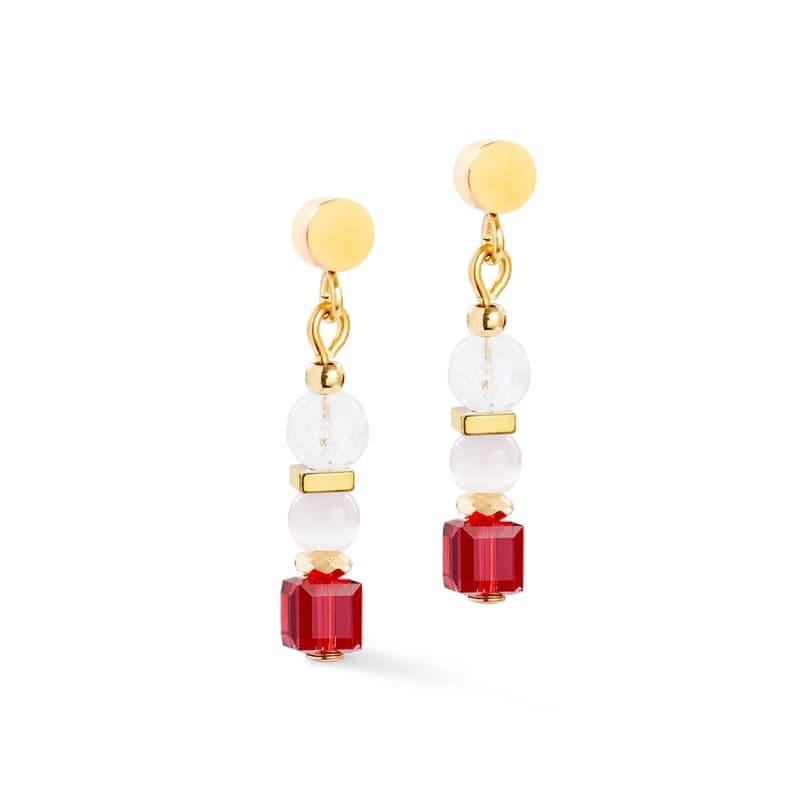 Deze oorknopjes van goudkleurig roestvrij staal hebben een totale lengte van 2,5 cm en een breedte van 0,4 cm. Het sieraad is opgebouwd uit een reeks verschillende elementen, waaronder ronde kralen van bergkristal en een rode kubusvormige kraal van Swarovski® kristallen aan de onderzijde. Dit model van COEUR DE LION combineert diverse slijpvormen en kleuren tot een compact geheel.