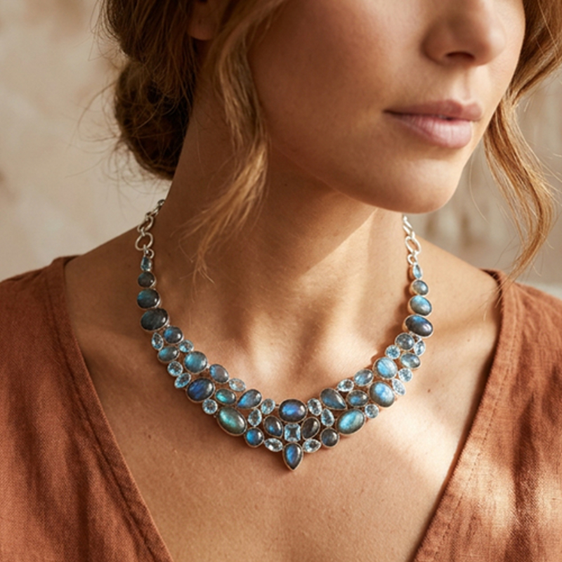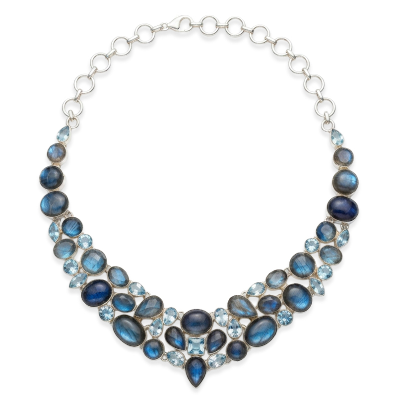 Het middenstuk van het collier is opgebouwd uit talloze edelstenen in uiteenlopende vormen, waaronder ovaal, rond, vierkant en druppelvorm. Dankzij de scharnierpunten op acht plekken vormt het sieraad zich soepel naar de contouren van de hals. De topazen zijn tussen de labradorieten geplaatst, die een duidelijke blauwe glans vertonen wanneer het licht erop valt.