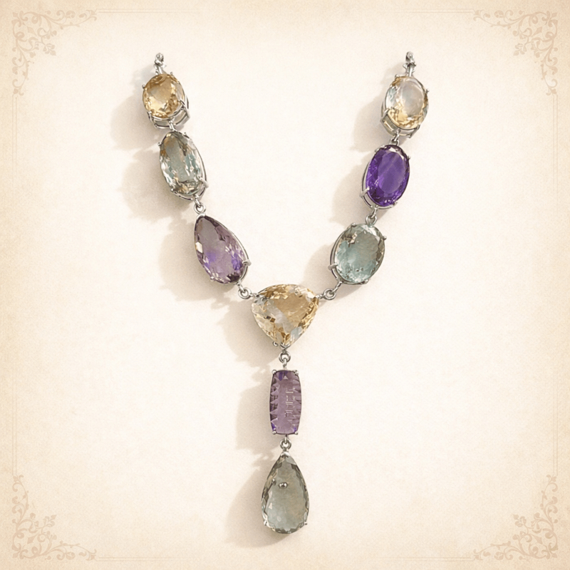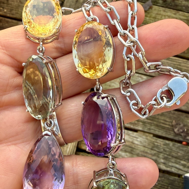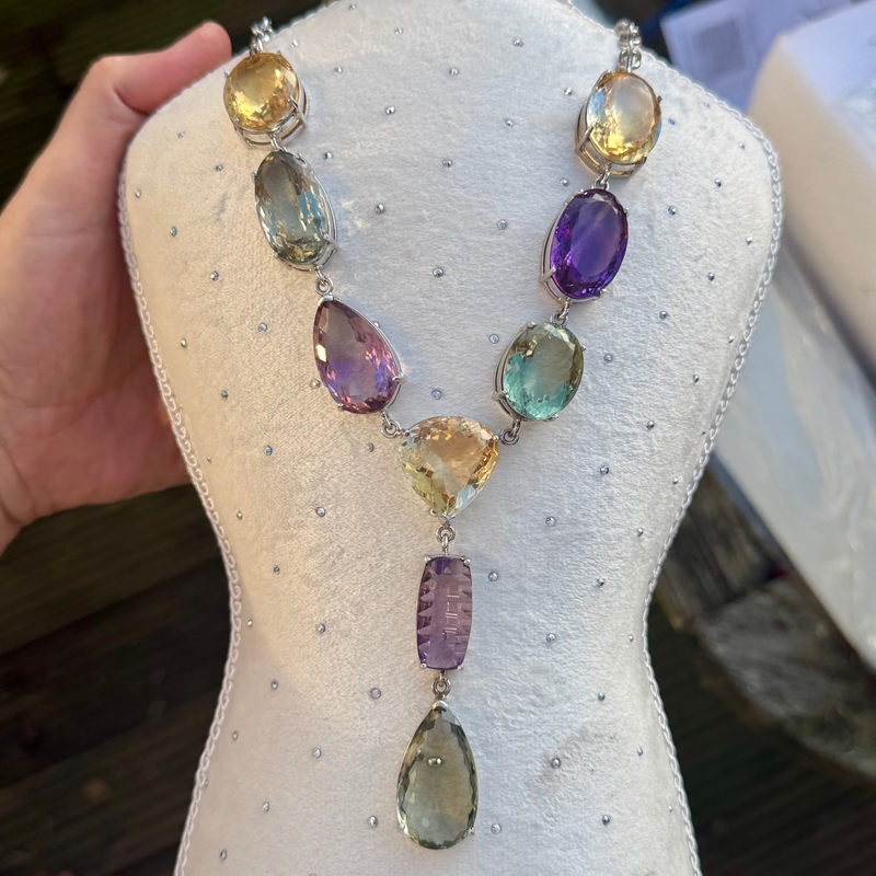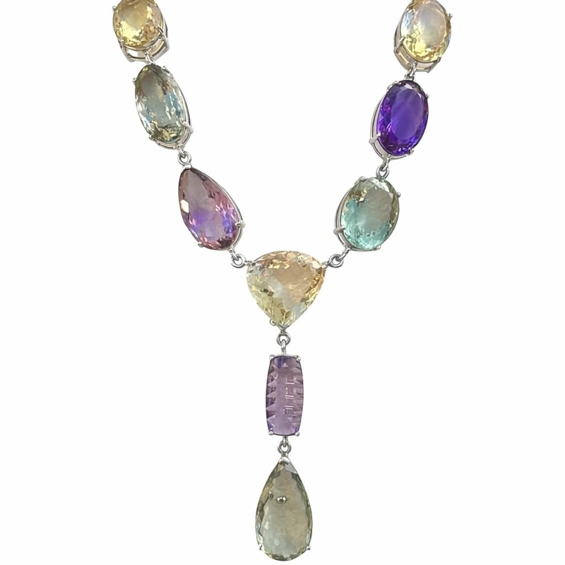 Dit elegante collier combineert paars en groen amethist en citrien elk gezet in open kasten van 1e gehalte zilver, in verschillende vormen, ovaal, driehoekig met zachte hoeken en druppelvormige stenen. Alle edelstenen zijn gefacetteerd. De achterzijde bestaat uit een schakelketting, terwijl de voorzijde in y model is ontworpen, een rechthoekige paarse amethist en druppelvormige groen amethist vallen mooi in het decolleté.