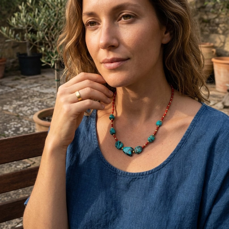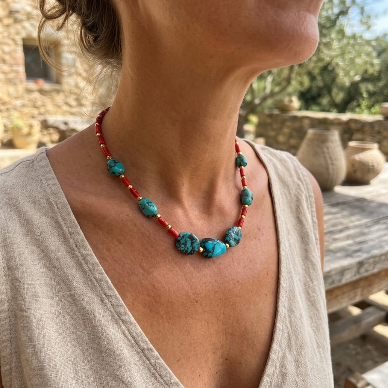 De opbouw van het snoer bestaat uit kralen van bloedkoraal die worden afgewisseld met kleine, vergulde hematiet tussenkraaltjes. Centraal in het ontwerp liggen de grotere turkoois kralen, die beschikken over de kenmerkende zwarte spinnenwebstructuur. Door de verschillende natuurlijke vormen van de stenen is de rijging afwisselend en evenwichtig van samenstelling.