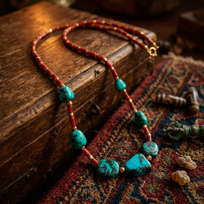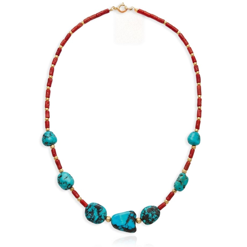 Dit collier van 45,5 cm combineert donkerrood bloedkoraal met zeven grillige stukken tibetaans turkoois. De ketting is vervaardigd met cilindervormige staafjes koraal en onregelmatig blauw turkoois, afgewerkt met een eerste gehalte verguld zilveren sluiting. De diepe rode tinten van de koraalelementen vormen een fraai contrast met de natuurlijke blauwe kleuren van de stenen uit Tibet.