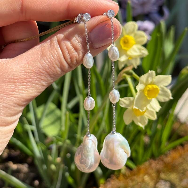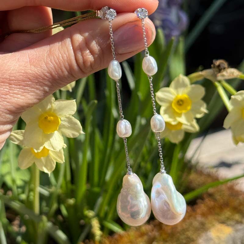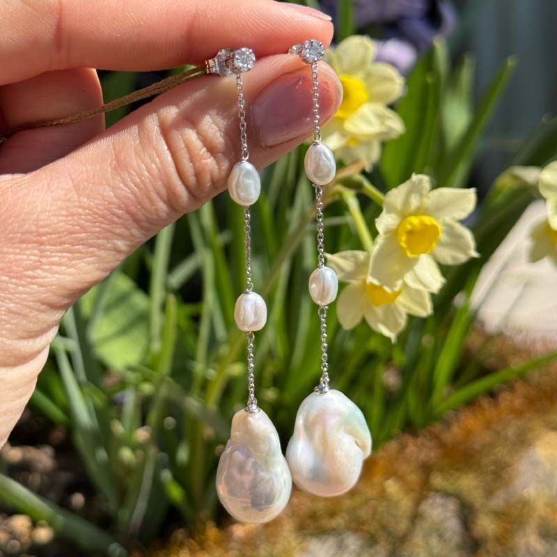 Deze 18 karaat witgouden oorstekers uit de Coscia collectie zijn een prachtig voorbeeld van vakmanschap en passie. Elke barokparel is anders, wat elk paar echt persoonlijk maakt. De stekers zijn bezet met kleine diamantjes (0.12 ct, SI/G), die net dat beetje extra glans geven. De oorbellen zijn 8,5 cm lang.