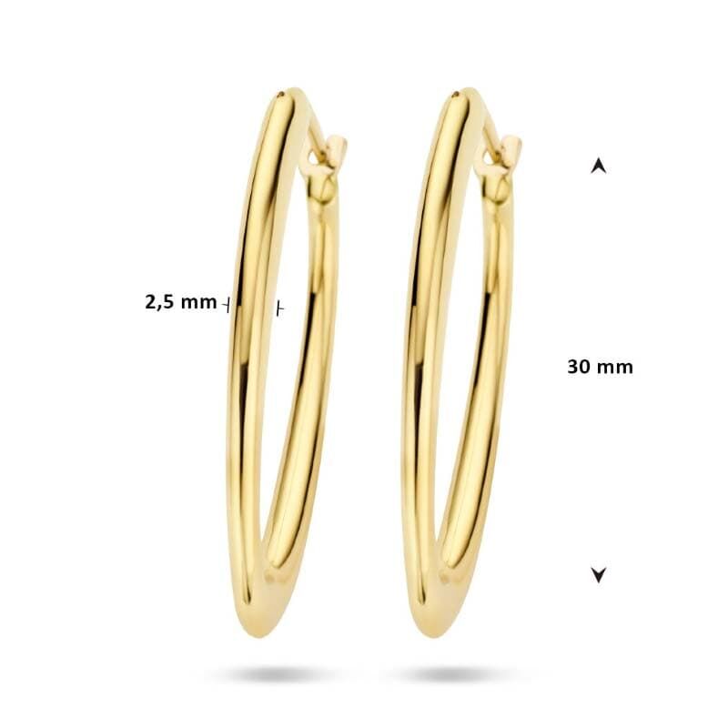 De ringen zijn uitgevoerd in 18-karaats geelgoud met een gepolijste afwerking voor een verfijnde glans. Met een diameter van 30 mm vallen ze mooi op, terwijl de breedte van 2,5 mm en het metaalgewicht van circa 2,75 gram zorgen voor licht en comfortabel draagplezier.