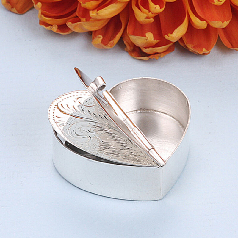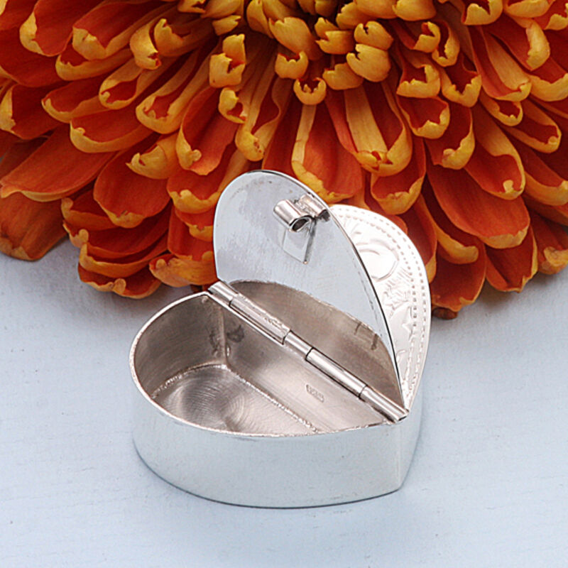 Zilveren pillendoosje in de vorm van een hart, nieuw in geschenkverpakking. Fijn gegraveerd doosje met 2 vakjes, het doosje is 3,4 x 3 cm en 1,1 cm hoog, 13 gram.