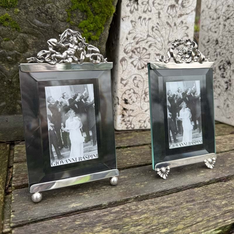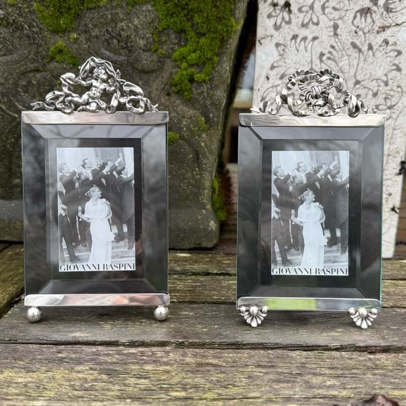 Prachtige zilveren fotolijst met een beschermengeltje gemaakt door de zilversmeden van Giovanni Raspini te Italië, nieuw in een luxe geschenkdoos. De 1e gehalte zilveren lijst bestaat uit twee gootjes waar glasplaatjes tussen zitten geklemd. Aan de achterkant zit en zilveren draaiknopje, daarmee kunt u de spanning van de zilveren gootjes iets verlichten waardoor de glasplaatjes eruit geschoven kunnen worden, dan kunt u de foto ertussen plaatsen, de glasplaatjes zijn facet geslepen. Onder het onderste gootje zitten twee ronde bolletjes als pootjes, de achterkant wordt ondersteund door een standaard.