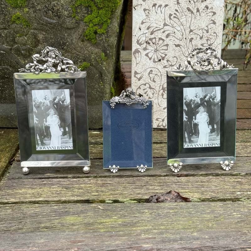 Prachtige fotolijst met een 1e gehalte zilveren montuur bekroond door een strik, nieuw gemaakt door Raspini in Italie. Mooie stevige fotolijst met geslepen glas. 16,2 x 8,8 cm en de fotomaat is 9 x 11 cm. U ontvangt de fotolijst in een luxe geschenkdoos.