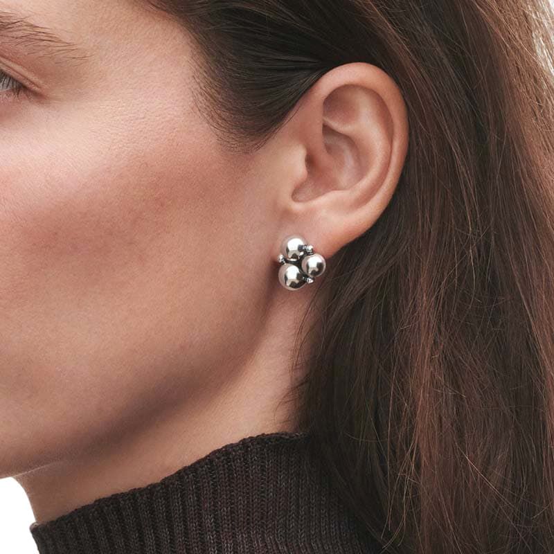 Stoere zilveren oorbellen met de iconische, vakkundig gemaakte kralen uit de Moonlight Grapes collectie van Georg Jensen. De oorstekers zijn gemaakt van 1e gehalte zilver (925) met een geoxideerde afwerking die de sculpturale vorm accentueert. Deze oorbellen zijn uitstekend te combineren met de andere sieraden uit de Moonlight Grapes collectie. Tip: draag deze oorstekers in het tweede gaatje naast de lange Moonlight Grapes oorbellen.