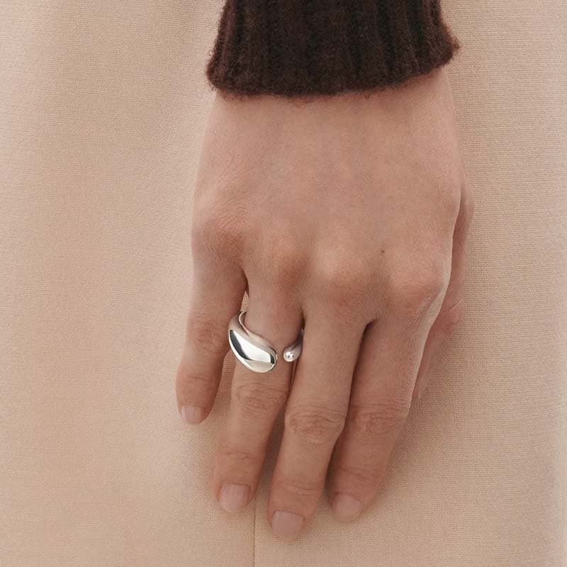 Zilveren ring Merci Large van Georg Jensen, nieuw in een geschenkdoosje. Organisch en sensueel, de Mercy-ring wikkelt zich zachtjes om je vinger en dient als een emotionele herinnering om altijd medelevend te zijn. De vloeiende vorm van de ring symboliseert de manier waarop het leven verandert en evolueert door onze ervaringen. De zachte rondingen vertegenwoordigen de stroom van tijd en hoe zijn onverwachte wendingen ons zouden kunnen definiëren. Breedte op het grootste deel van de ring is 10 mm.