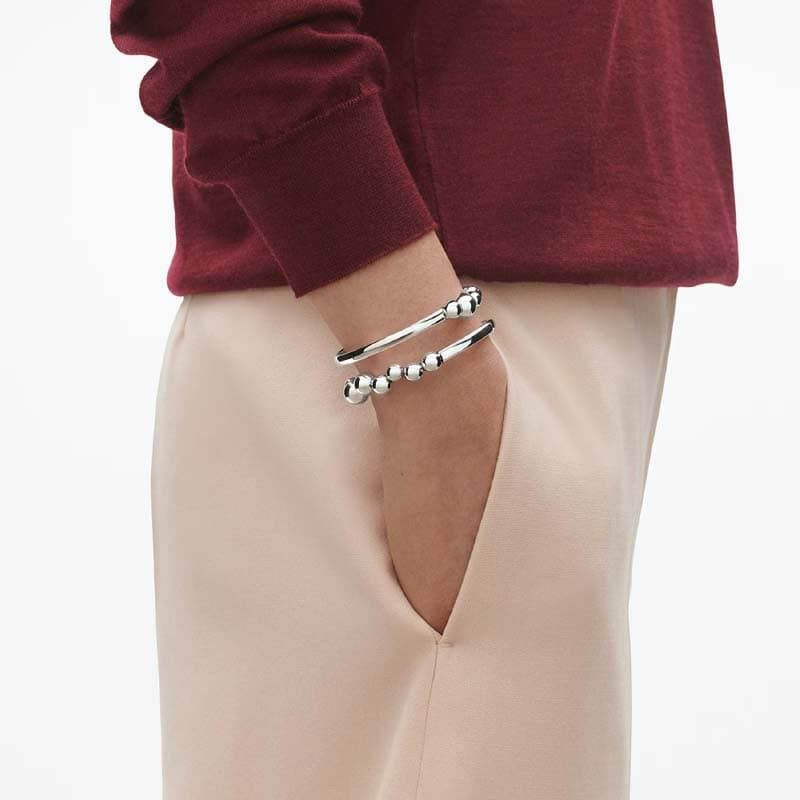 Een prachtige, zilveren bangle uit de Moonlight Grapes collectie van Georg Jensen, nieuw in geschenkverpakking. De 1e gehalte zilveren (925) spangarmband stelt twee druivenranken voor, die zich om de pols wikkelen. De bangle bestaat uit twee ranken, aan de ene rang zitten 7 zilveren druiven, op de andere rank 9 stuks, in verschillende groottes.