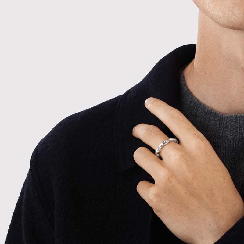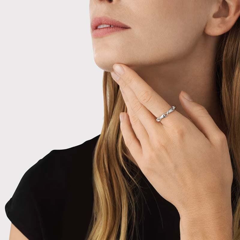 1e Gehalte zilveren ring met mooie schakels, de ene schakel omhelst steeds de volgende schakel wat een eigentijdse kijk op de traditionele schakelring creëert. Een gedurfde look met Georg Jensens sculpturale vormentaal!
