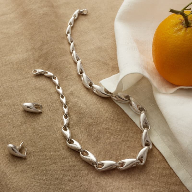 Zilveren ketting met organisch gevormde schakels uit de Reflect Collection van Georg Jensen, ontworpen door Jacqueline Rabun, nieuw in geschenkverpakking.