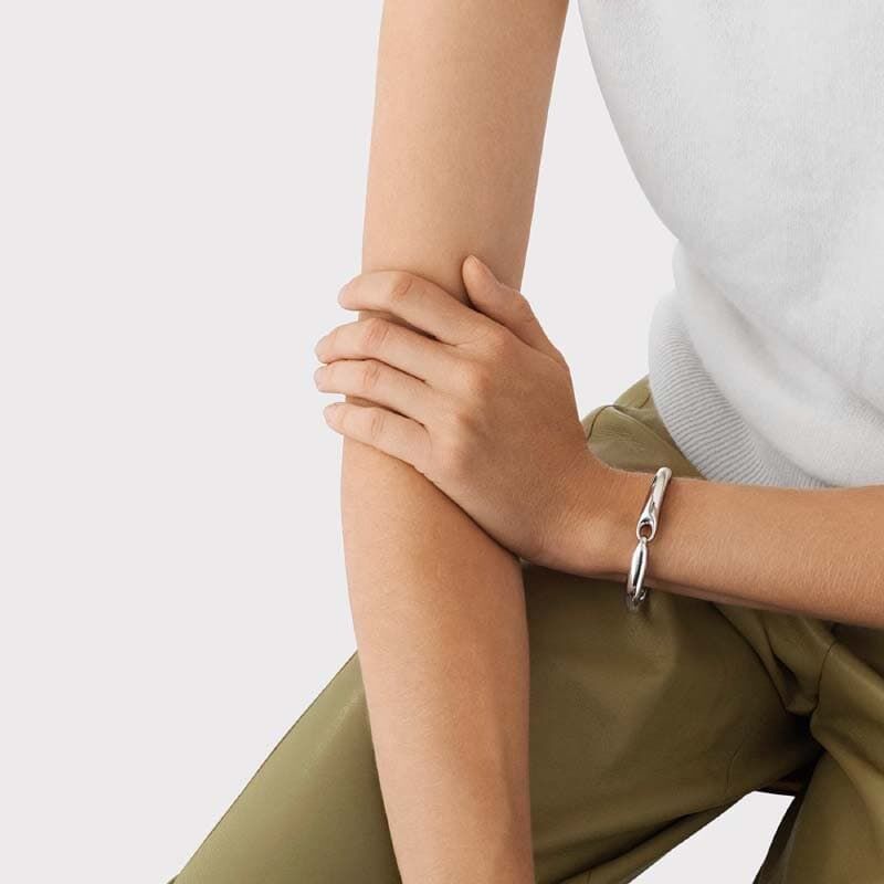 Stevige zilveren armband uit de Reflect Collection van Georg Jensen ontworpen door Jacqueline Rabun, nieuw in geschenkverpakking. 1e Gehalte zilveren bangle waarbij de twee schakels elkaar vastgrijpen in een innige omhelzing, waardoor ze de pols omsluiten wat een sculpturaal sieraad vormt. Het statement stuk draait om het vieren van de kracht en schoonheid van individualiteit en is te openen en te sluiten door middel van een geïntegreerd scharnierslot.