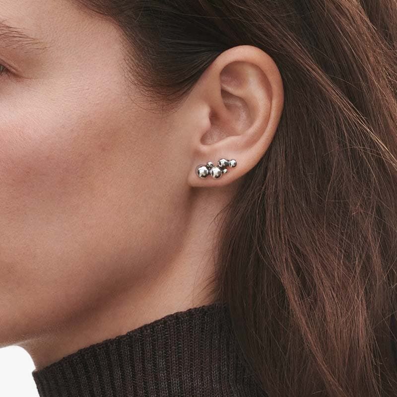 Zilveren oorbellen Moonlight Grapes small uit de collectie van Georg Jensen, het vroegere Art Nouveau druivenmotief in een nieuw, eigentijds jasje. De oorstekers zijn gemaakt van 1e gehalte, geoxideerd zilver, samengesteld uit een dicht cluster van zilveren kralen. De geoxideerde afwerking zorgt voor diepte en contrast, de oorbellen kunnen als paar gedragen worden, u kunt de oorbel ook combineren met één van de andere oorbellen uit de Moonlight Grapes collectie. De oorbellen worden wel per paar verkocht.