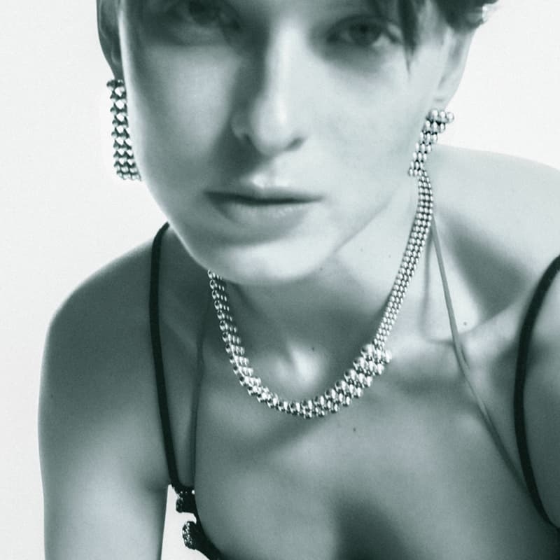 Dit luxe collier is het bepalende stuk van de samenwerking tussen Georg Jensen en A. Roege Hove, door de lineaire patronen van de breistijlen van de Deense ontwerper te combineren met de iconische kralen (druiven) uit de Moonlight Trapes-collectie, is het stuk een uitdrukking van tweee ambachten die samenkomen. Het collier is voorzien van drie rijen sterling zilveren kralen in verschillende maten, wordt gekenmerkt door een opvallend gevoel van beweging en kan worden geopend en gesloten via een naadloos geïntegreerd verschuifbaar balletslot.