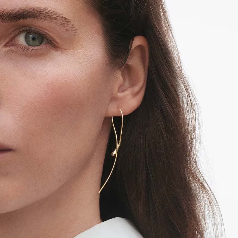 Gouden doortrek oorbellen Merci ontworpen door Jacqueline Rabun voor Georg Jensen, nieuw in een geschenkdoosje. Deze opvallende en verfijnde oorbellen zijn gevormd uit een organisch vloeiende streng van 18 karaat geelgoud die sensueel rond de oorlellen draaien en vervolgens in elkaar wikkelen. Ontwerpster Jacqueline Rabun vindt dat sieraden even emotioneel als mooi moeten zijn. Haar Mercy collectie voor Georg Jensen neemt het verstrijken van de tijd als uitgangspunt en de resultaten zijn sensueel, organisch en vrijgevochten. De gouden Mercy oorbellen zijn 5,6 cm lang en ze wegen samen 2,9 gram.