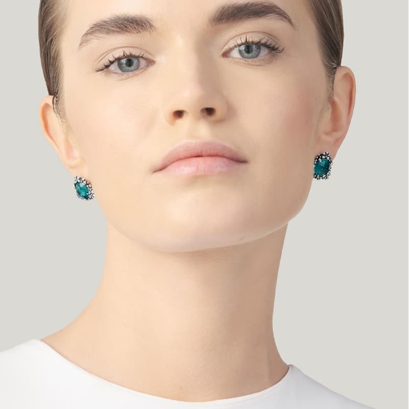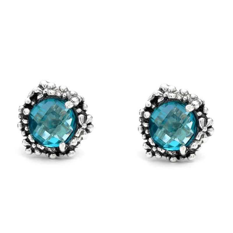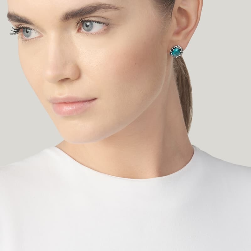 Een heldere hemelsblauwe schittering staat centraal in deze oorbellen van Giovanni Raspini, uitgevoerd in sterling zilver met een groot, rond en gefacetteerd blauw kristal. De zetting is gegoten met de verlorenwasmethode en omlijst het kristal met een fijn bloemenmotief. Handgemaakt in Italië, met een hoogte van 1,6 cm en een gewicht van 3,5 gram per oorbel. De oorstekers sluiten met een vlinder sluiting.