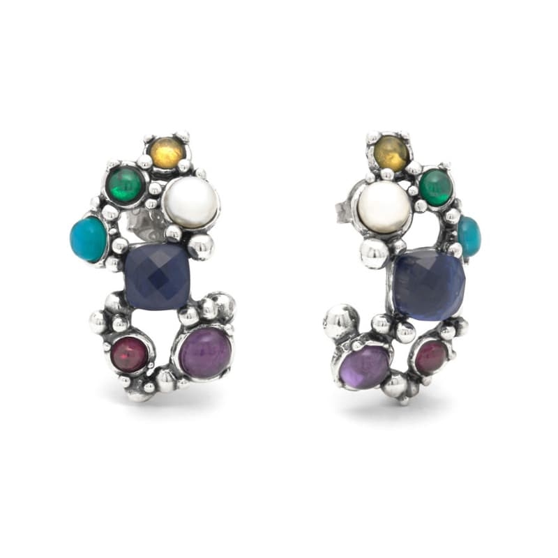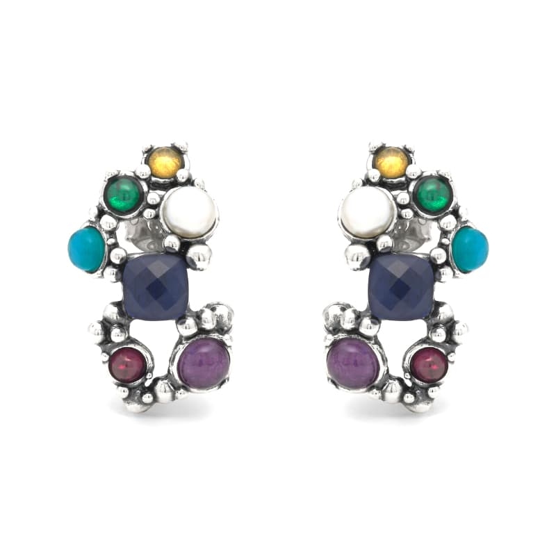 Bij elke beweging vangt het gefacetteerde blauwe kristal het licht, omlijst door een speels palet aan stenen en parelmoer. Deze Cocktail Big oorbellen zijn ontworpen en handgemaakt door Giovanni Raspini in sterlingzilver (925), met amethist, natuurlijke parel, kristallen, parelmoer en siamiet. Het gepolijste zilveren frame houdt de veelkleurige cabochons en zoetwaterparels mooi in balans. De oorbellen zijn 3,3 cm lang, wegen 6,6 gram per stuk en sluiten met een stevige vlindersluiting.