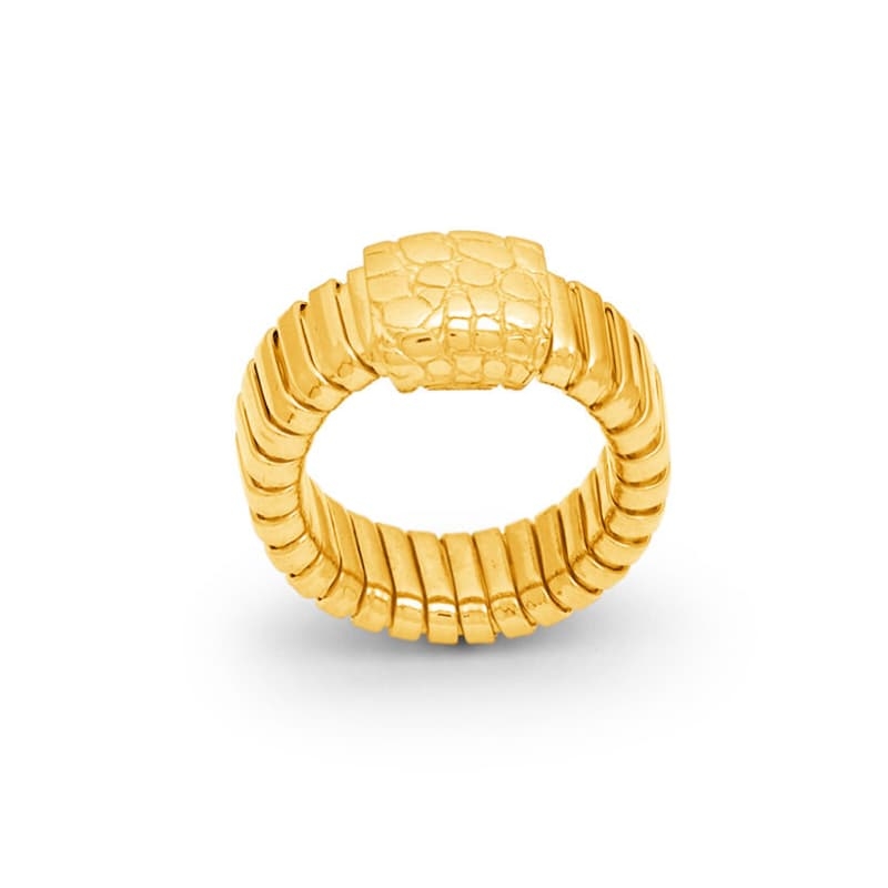 Deze ring is met de hand vervaardigd in Italië. De tubogas-structuur geeft het ontwerp ritme en volume, terwijl het croco-motief in het midden voor extra diepte en contrast zorgt. Juist die combinatie van strakke lijnen en rijke textuur maakt het sieraad herkenbaar en bijzonder. De geribbelde scheen is 7 mm breed, het Croco ornament is 10 x 10 mm.