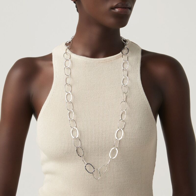 Giovanni Raspini zilveren schakelcollier ovaal. Sierlijk zilveren schakelcollier met smalle glanzende schakels en platte gehamerde schakels. Het 1e gehalte zilveren collier heeft een stevige karabijn sluiting en is 92 cm lang. De schakels zijn 2,4 x 1,6 cm. U ontvangt het collier in cadeauverpakking.