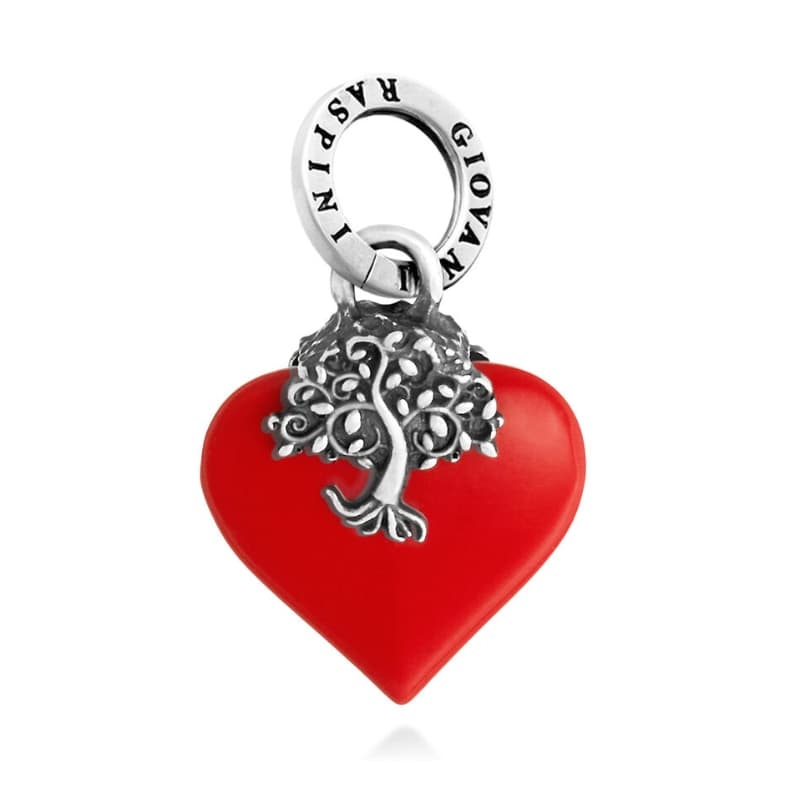 Diep koraalrood resin geeft deze hartbedel een warme, levendige uitstraling, bekroond met een zilveren levensboom aan beide kanten. Deze bedel is van Giovanni Raspini en is uitgevoerd in gebrand zilver, vervaardigd met de verloren-was giettechniek. De hanger is 1,8 cm lang zonder hangoog. Het hart staat symbool voor liefde, terwijl de levensboom vaak wordt gezien als teken van groei en verbondenheid.