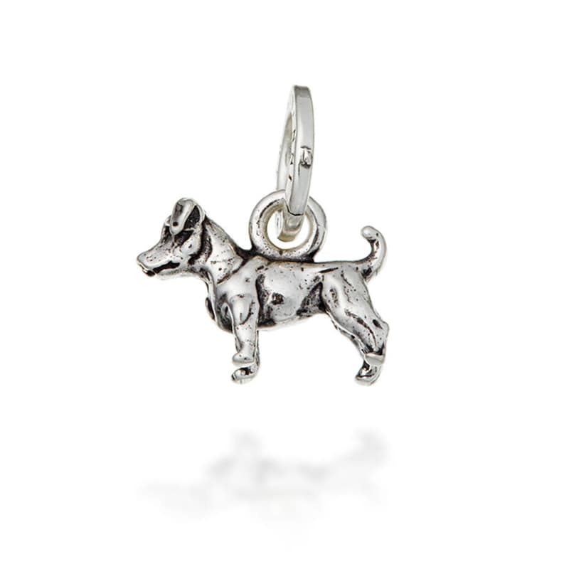 Deze charmante bedel vangt de levendige uitstraling van een Jack Russel in glanzend zilver. Het is een handgemaakte Giovanni Raspini bedel van 1e gehalte zilver, uitgevoerd als hondje met fijne details in kop, poten en staart. De bedel is circa 1,1 cm lang (zonder hangoog) en is met het stevige hangoog eenvoudig aan een armband of kettinkje te dragen. Een hond staat vaak symbool voor trouw en vriendschap: een klein sieraad met een persoonlijk verhaal.