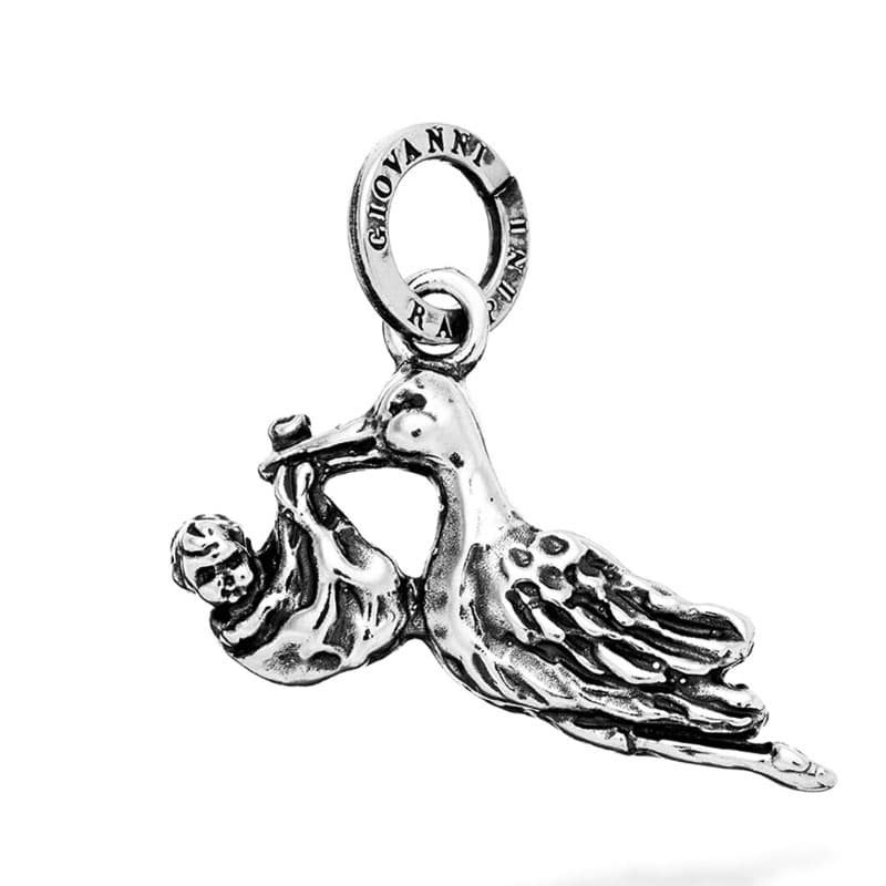 Deze hanger van eerste gehalte zilver stelt een vliegende ooievaar voor die een baby in een doek draagt. Het sieraad heeft een afmeting van circa 2 bij 2,5 centimeter en is voorzien van een stevig hangoog van de ontwerper Giovanni Raspini. De bedel is volledig vervaardigd uit massief zilver en is aan beide zijden gedetailleerd uitgewerkt.