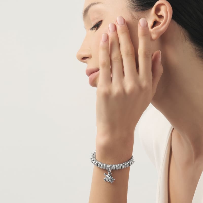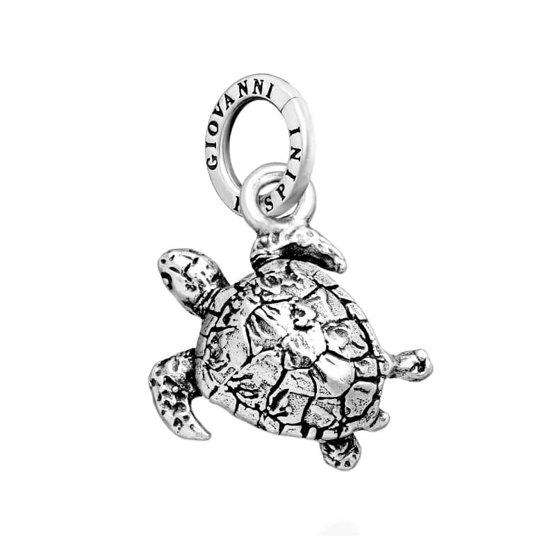 Deze Giovanni Raspini zilveren bedel in de vorm van een zee schildpad vangt het licht in zijn reliëf en geeft je sieraad direct een speels, maritiem accent. De bedel is handgemaakt in Italië van 1e gehalte zilver en meet 2,1 cm lang (zonder hangoog). Het schildpadmotief staat vaak symbool voor rust, bescherming en een lange levensreis, waardoor dit een betekenisvol detail is aan een armband of ketting.