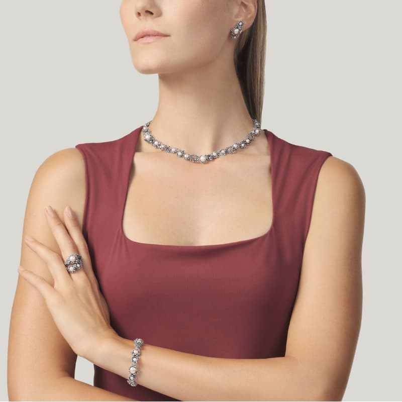 Materiaal: sterling zilver met natuurlijke roze parels. Handmade in Italy.