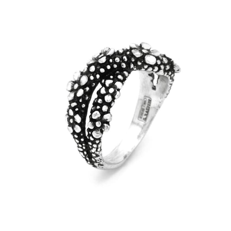 Deze ring is gemaakt van gepolijst zilver en is vervaardigd met het ambachtelijke lost-wax casting proces. Daarna is de ring afgewerkt met een diamond dressing effect. Dat zorgt ervoor dat de kleine zilveren bloemblaadjes subtiel glinsteren, alsof er een zacht licht overheen valt. Het resultaat is een sierlijke, bloemige look met veel detail.