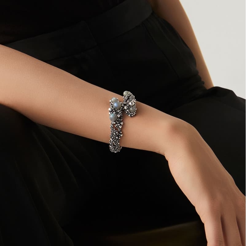 De klemarmband is gemaakt met labradoriet: een steen die bekendstaat om zijn iriserende schittering. Afhankelijk van het licht zie je tinten die veranderen van grijs naar verschillende blauwtinten. Dat geeft de armband een levendige, bijna magische uitstraling die steeds weer anders is. De armband heeft een scharnier, waardoor het aan- en afdoen gemakkelijk is.