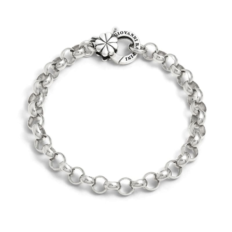 De rolo-schakels zijn gelijkmatig vormgegeven en vormen een solide geheel. De sluiting is bewust gedecoreerd met het klavertje vier, een herkenbaar symbool dat voor geluk staat. Vanwege de open constructie van de schakels is het eenvoudig om hangers over de gehele lengte van de armband te plaatsen.