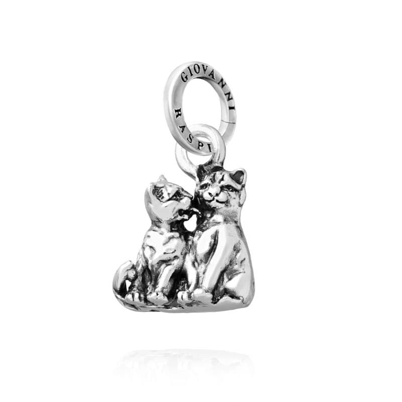 Deze zilveren bedel van Giovanni Raspini toont twee zittende poezen en is 1,5 cm hoog, exclusief het hangoog. Het sieraad is in Italië vervaardigd van eerste gehalte zilver. De vormgeving is compact en de twee figuren vormen samen één solide geheel. Aan het ronde hangoog is de merknaam gegraveerd, wat zorgt voor een stevige verbinding met een armband of een collier.
