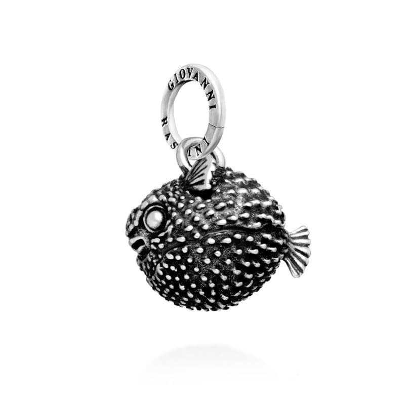 De bedel is opgebouwd met een uitgesproken reliëf waarbij donkere accenten in de dieper gelegen delen worden gecombineerd met gepolijst zilver op de hoger gelegen punten. Hierdoor komt de structuur van de puntjes en de vinnen duidelijk naar voren. Aan de bovenzijde bevindt zich een breed hangoog met merkstempel, waardoor de hanger vrij kan bewegen aan een collier of armband.
