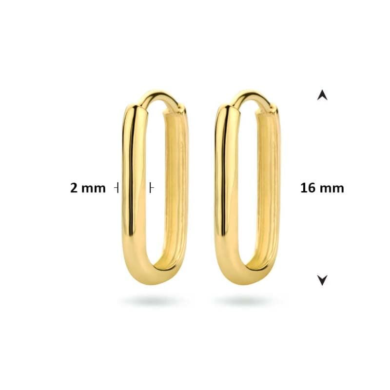 De oorringen hebben een afmeting van 16x2mm: 16 mm hoog en 2 mm breed. Het metaalgewicht is circa 1,23 g. Door het compacte formaat zitten ze comfortabel en voelen ze licht aan. Dankzij de gepolijste afwerking ogen ze netjes en verzorgd. De klapsluiting maakt ze snel in en uit te doen, handig als je vaak wisselt of ze graag de hele dag draagt.