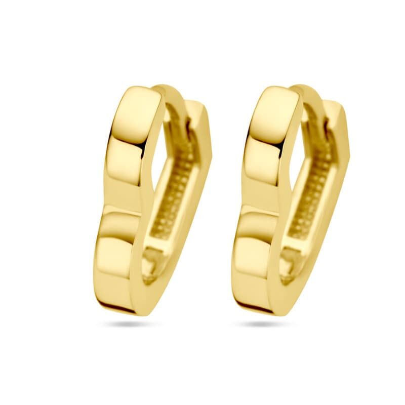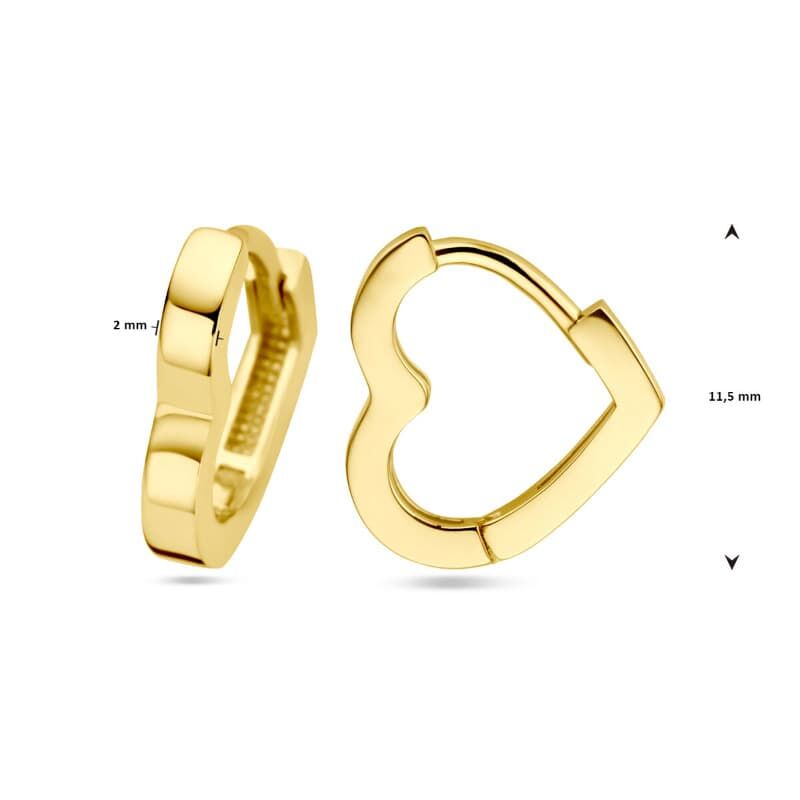 Geelgouden klapoorringen in de vorm van een hartje uit de Home Collectie. De hartjes hebben een afmeting van 11,5 x 2 mm. De scharniertjes in de oorringen vergemakkelijken het in- en uitdoen. Het metaalgewicht is circa 1,78 gram.