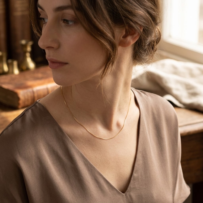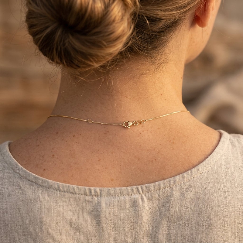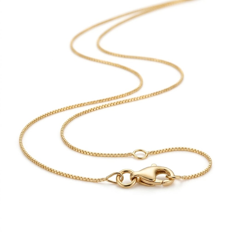 De constructie bestaat uit kleine kubusvormige schakels die nauwsluitend in elkaar zijn gezet. Dit zorgt voor een compacte en gladde structuur van de ketting. Het sieraad is voorzien van een degelijke karabijnsluiting voor een veilige bevestiging.