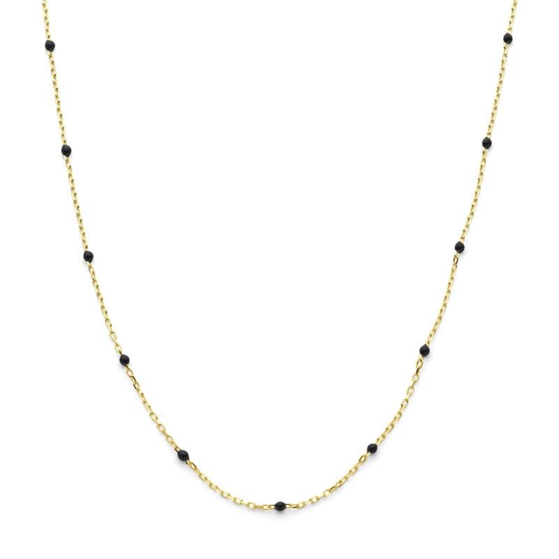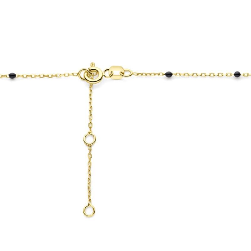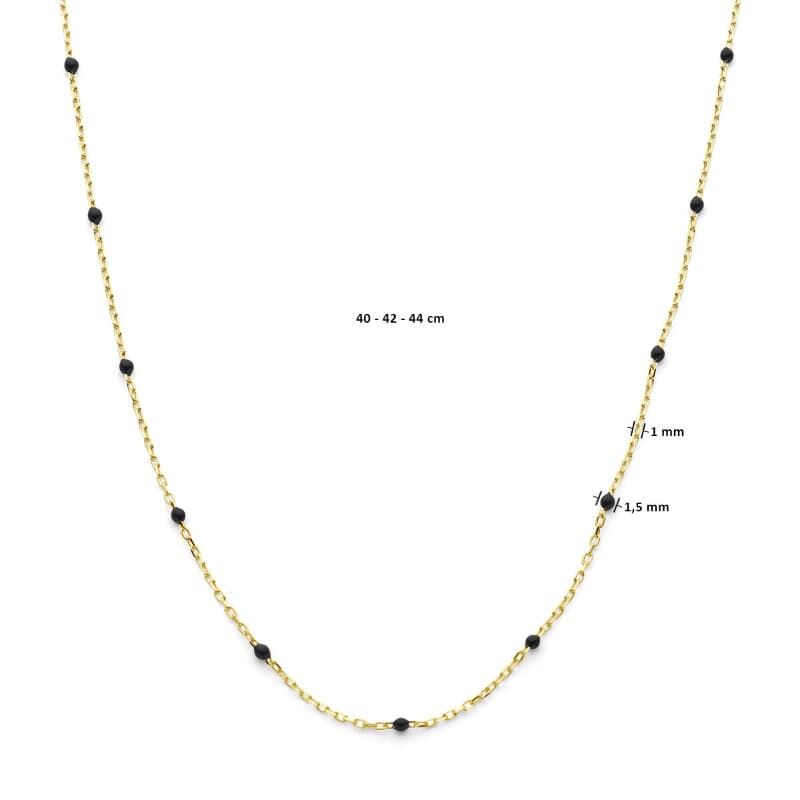 Deze prachtige geelgouden ketting met verfijnde zwarte emaille bolletjes is een echte must-have! Gemaakt van 14 karaat goud en voorzien van elegante ankerschakels, straalt dit collier pure klasse uit. De subtiele schakelbreedte van 1 mm en de fijne afwerking maken het perfect om dagelijks te dragen.