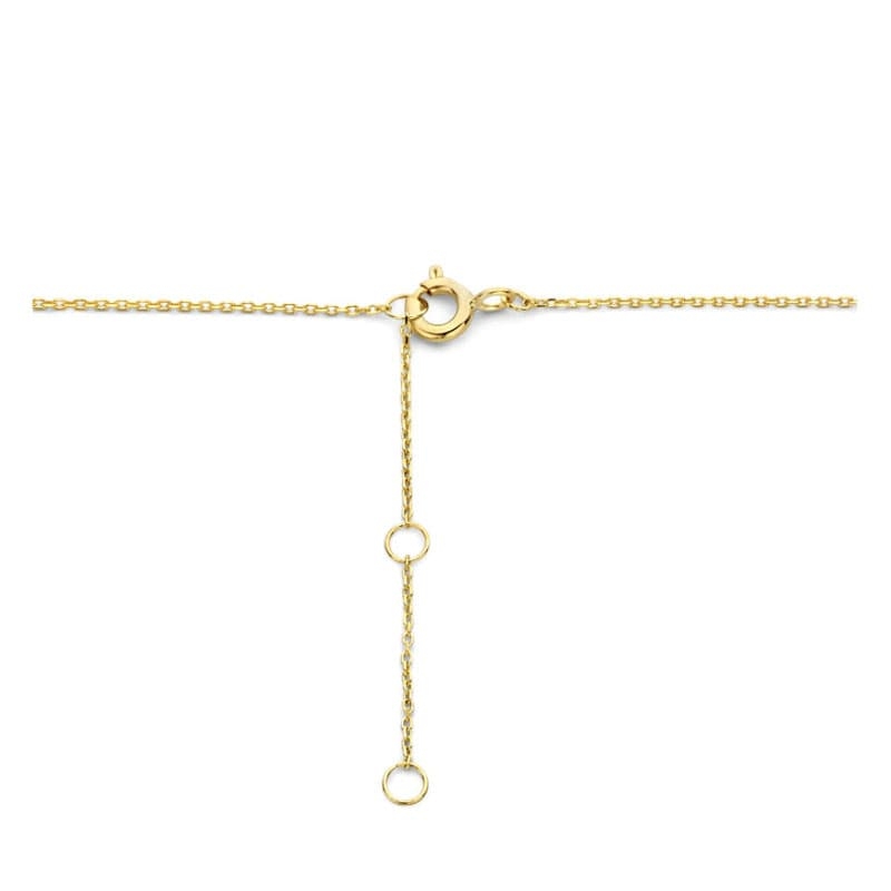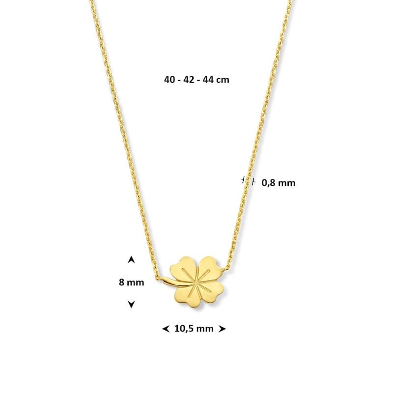 Dit 14 karaat geelgouden collier is uitgevoerd met een klavertje vier aan een fijne schakel van 0,8 mm breed. Het sieraad is volledig vervaardigd uit geelgoud en beschikt over drie instelbare draaglengtes van 40, 42 en 44 centimeter. Door de extra aanhaaloogjes aan het uiteinde van de ketting kan de drager zelf de gewenste hoogte in de hals bepalen.